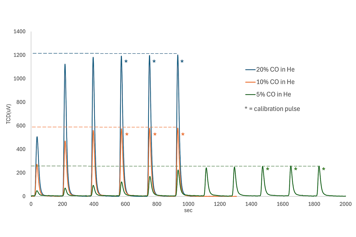 The metal dispersion rate is a critical parameter in heterogeneous catalysis. It refers to the proportion of metal atoms that are exposed on the surface of a catalyst relative to the total number of metal atoms present (often expressed as a percentage). Metal dispersion can be calculated through pulse chemisorption using gases such as CO or H2, which selectively chemisorb onto the metal surface. This is achieved by continuously pulsing a specified amount of gas into the sample until saturation is reached. Pulse measurement determines the chemisorbed quantity by taking the saturated peaks as a reference. The difference in peak areas between unsaturated and saturated state is giving the adsorbed amount. The metal dispersion rate is essential for assessing, optimizing, and understanding the performance and longevity of metal-based catalysts.